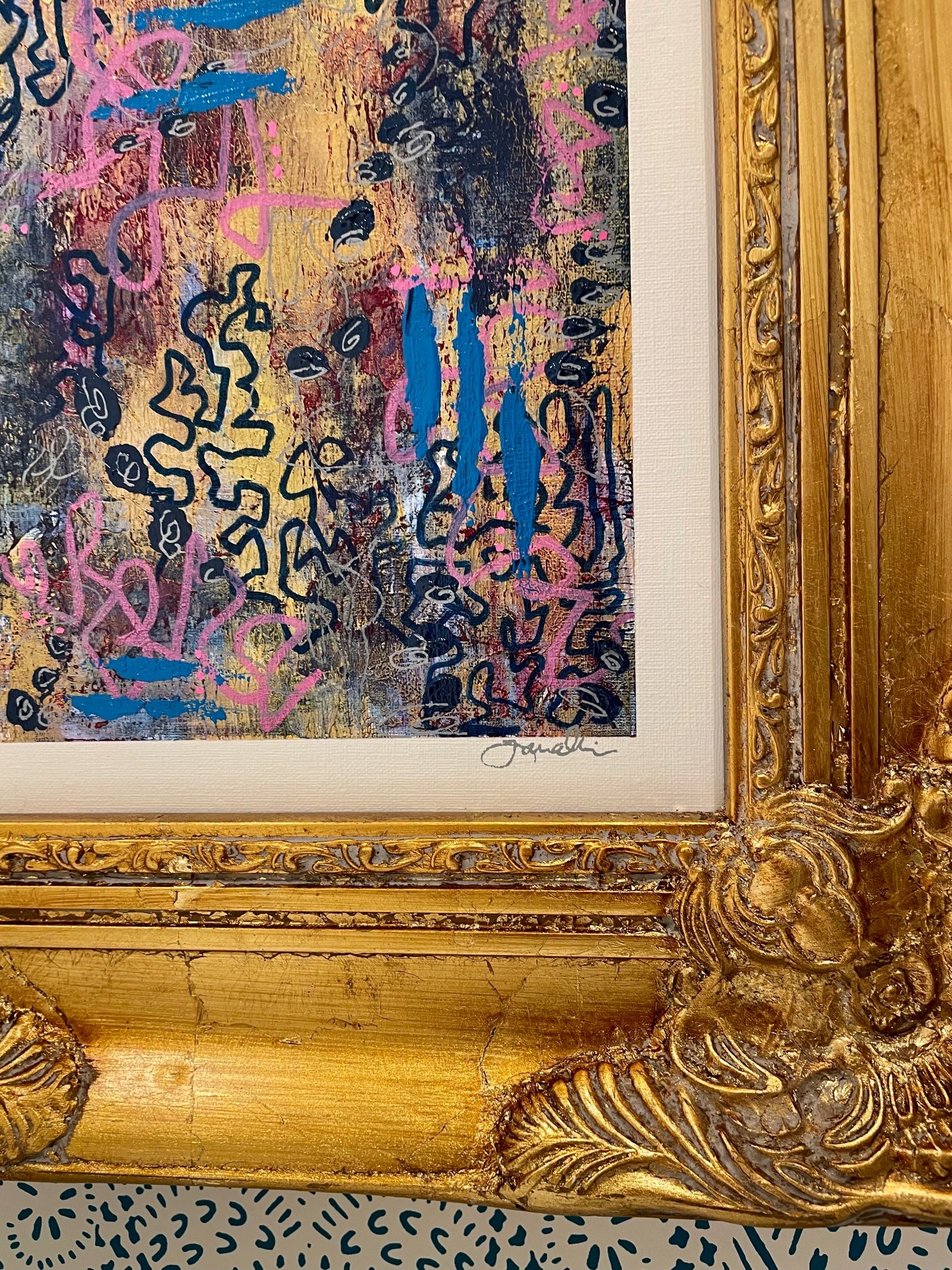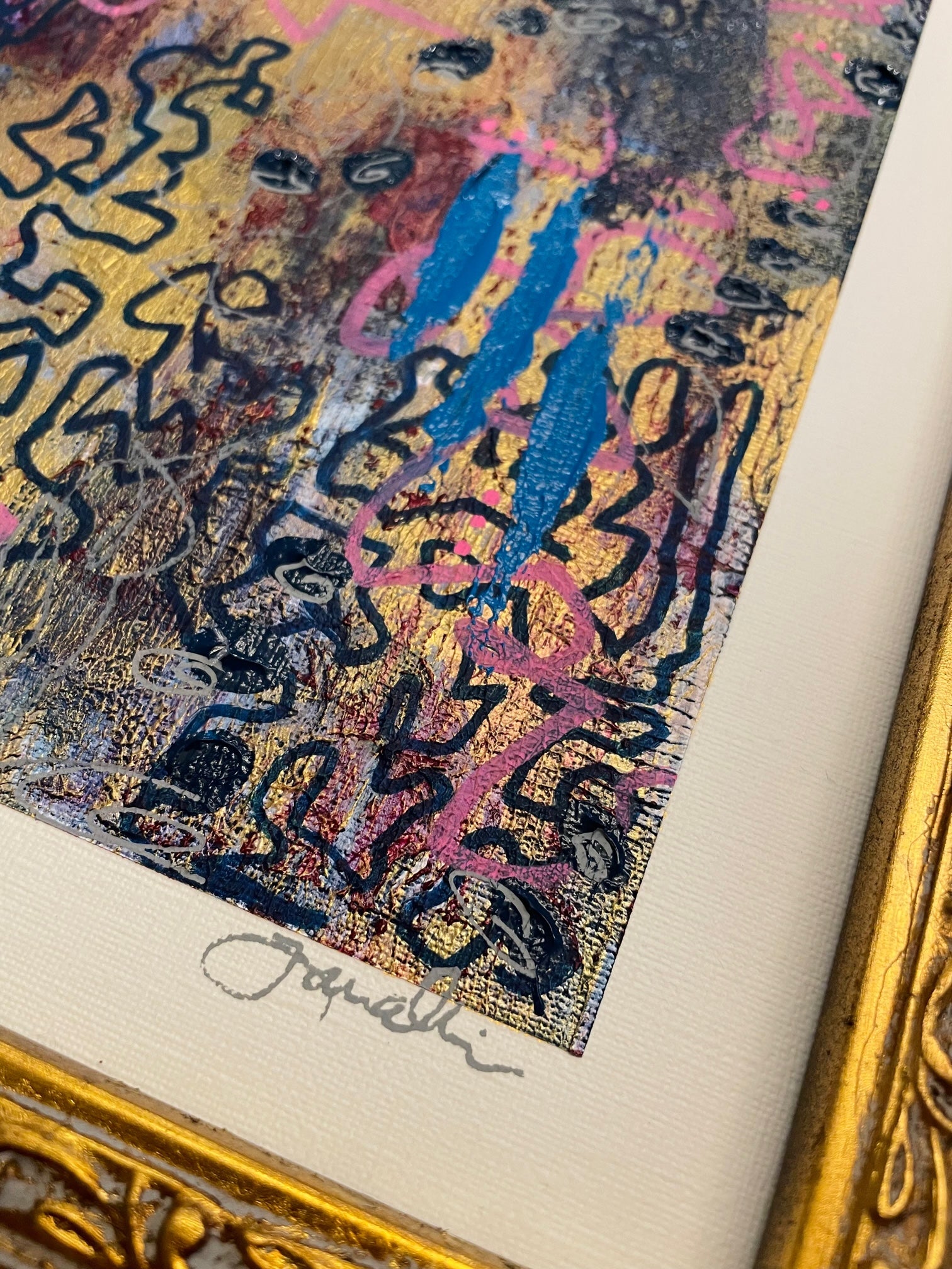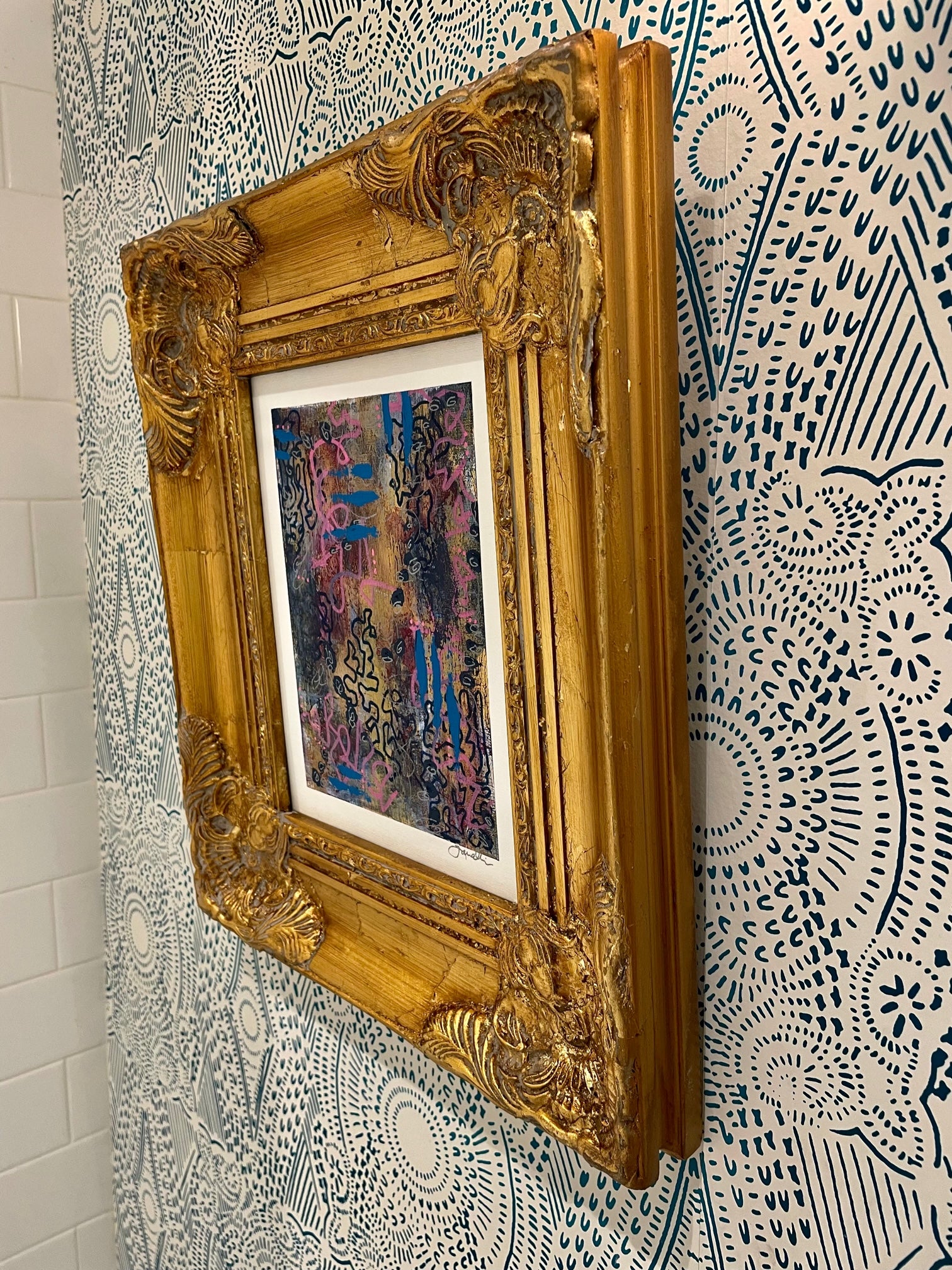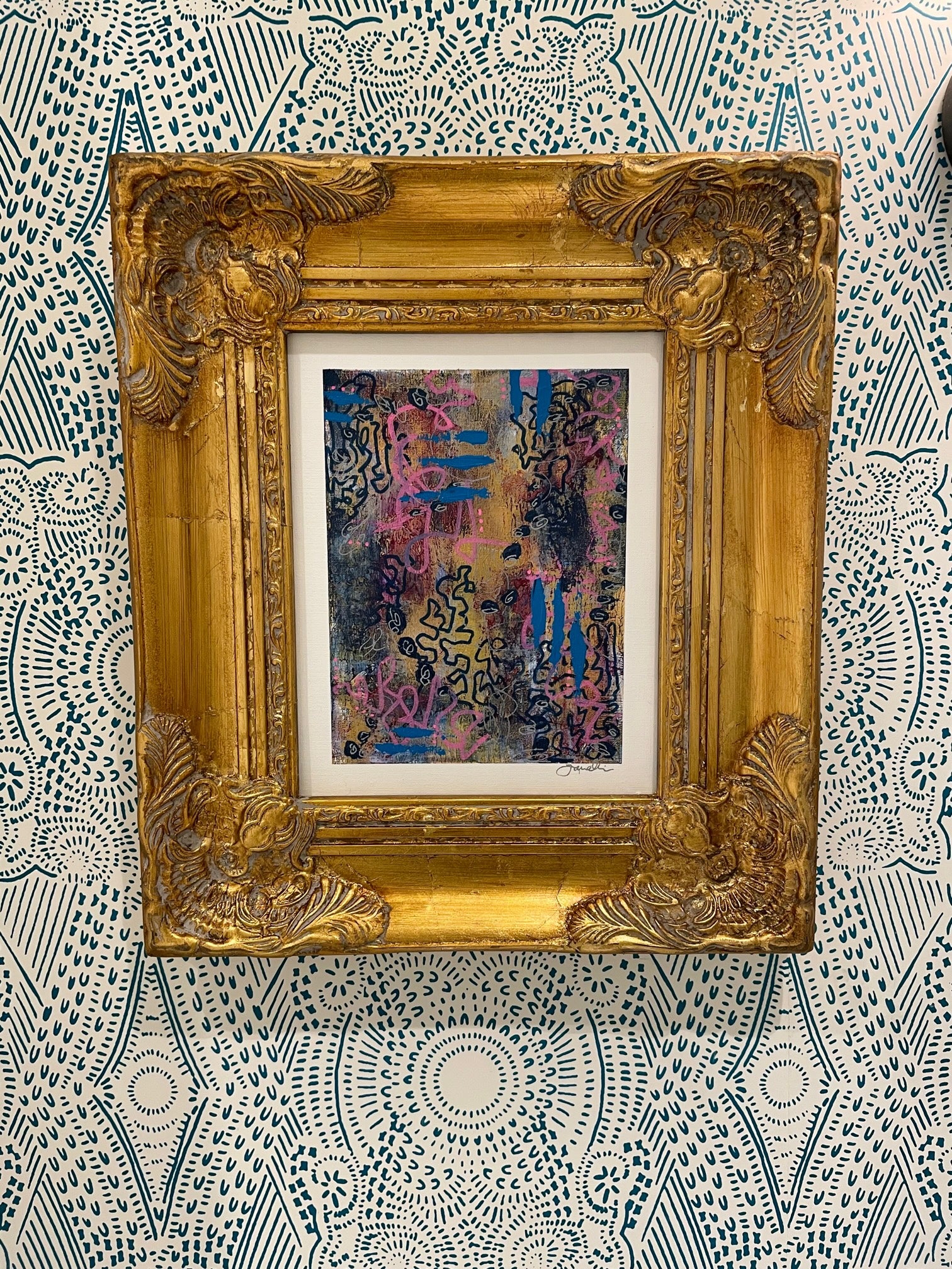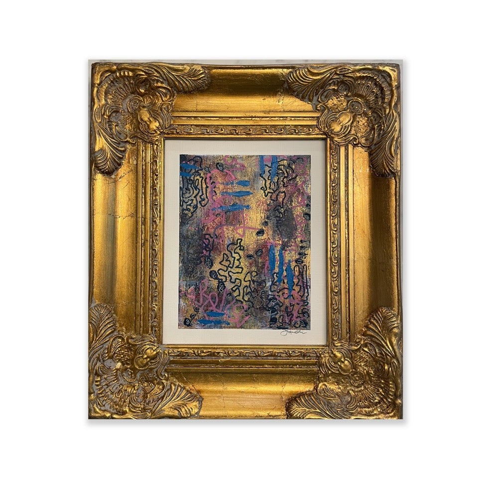 8x10 original painting. Mixed Media on canvas board. Custom framed in antique style gold frame. Signed by artist in the bottom right corner. Piece measures approx 15.25h x 13.25w x 1.5d including frame. Wired and ready to hang.