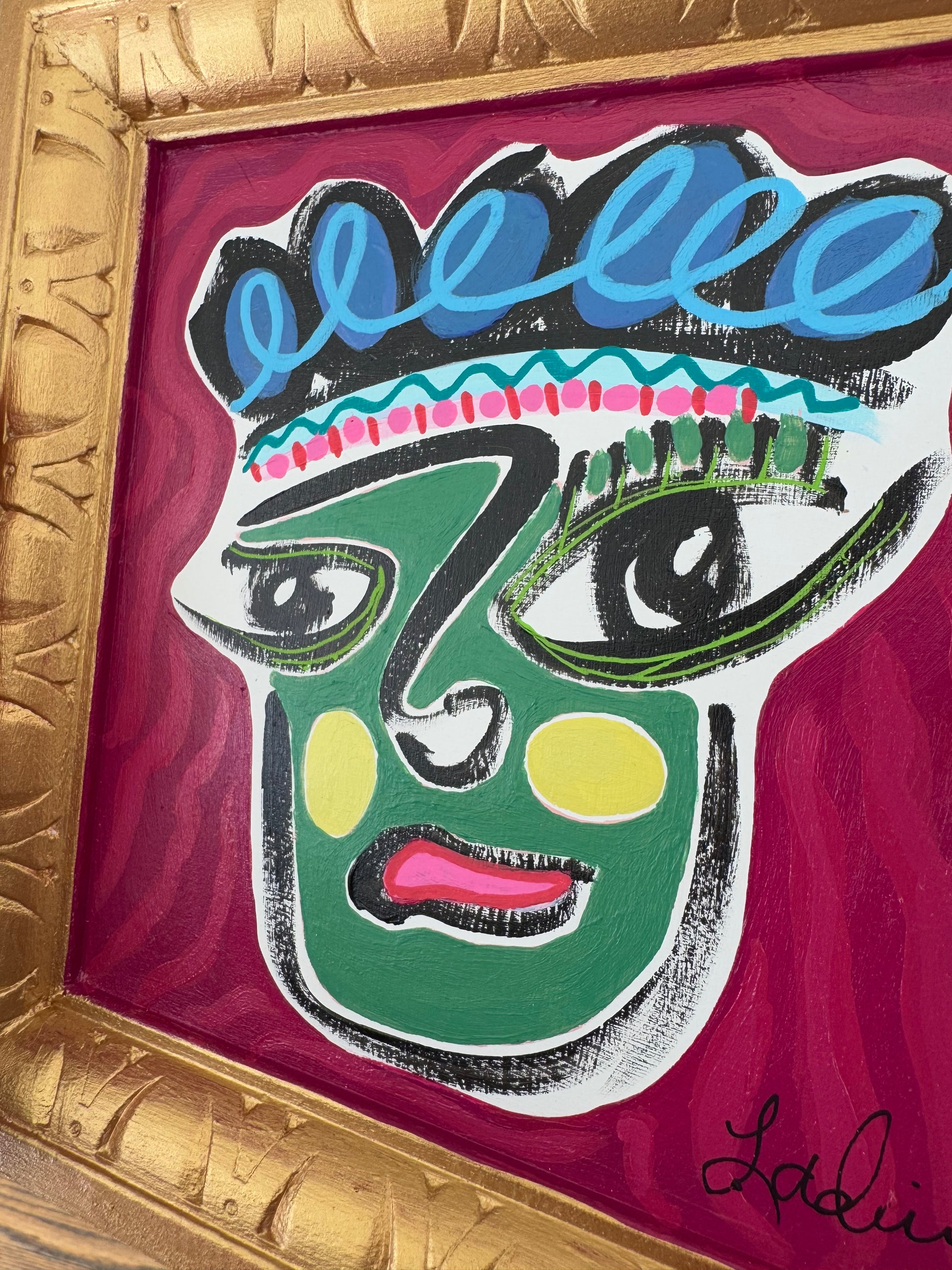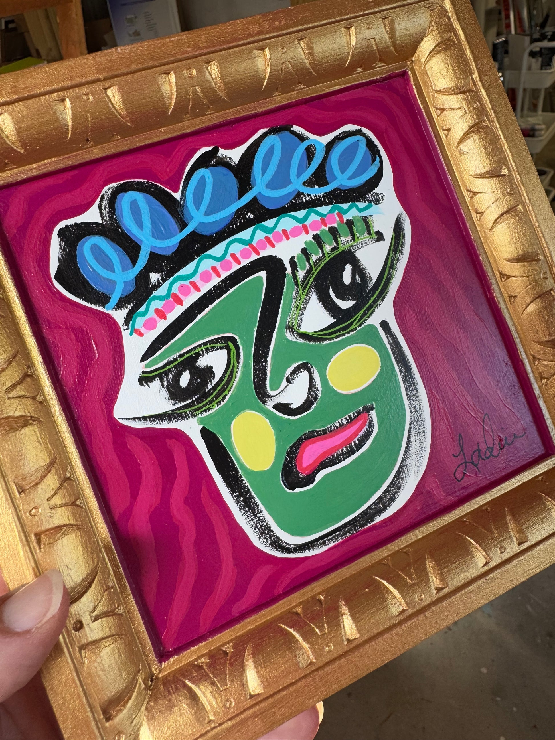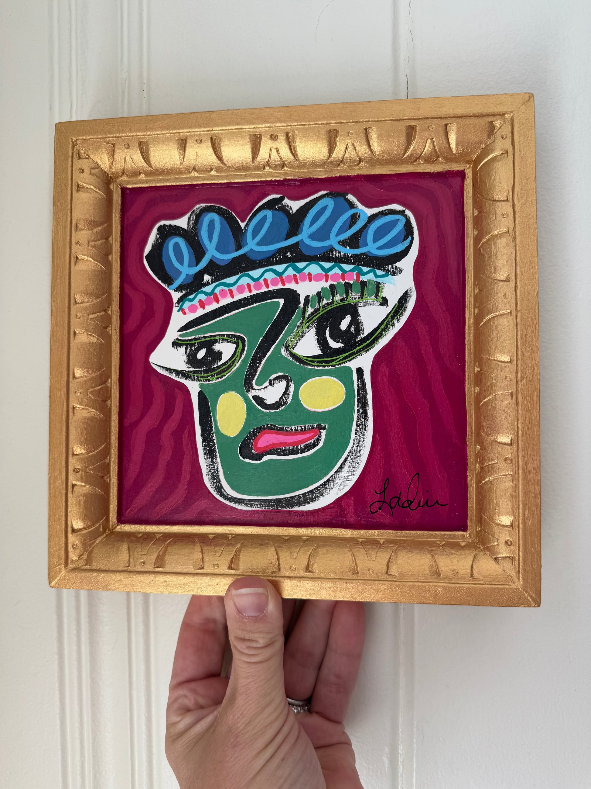 Original Funky Face painting on board. Painting and frame measure approximately 8" x 8".  The piece and custom frame are hand cut and handmade so measurements do vary slightly. Perfect for wall hanging or display on a shelf/tabletop. Hanging hardware included.