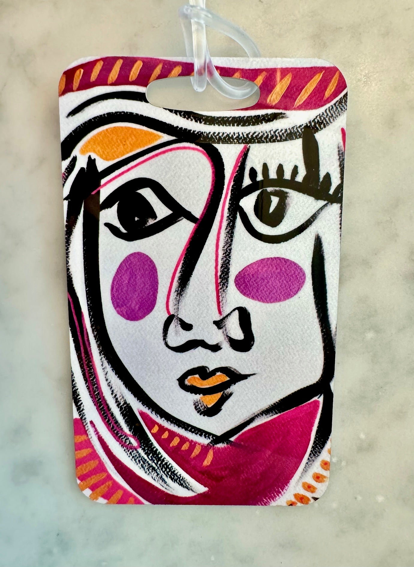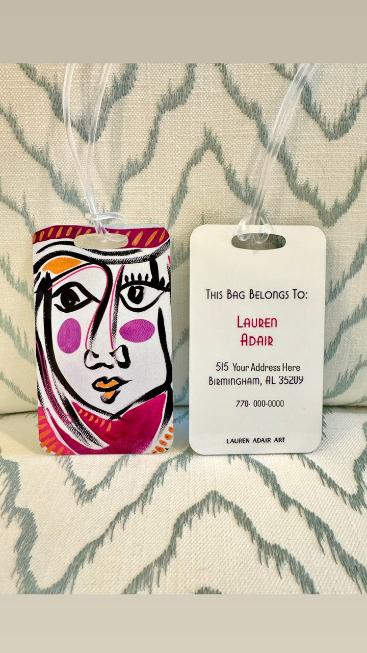 These glossy tags measure 2.5" by 4.5" and are printed on premium aluminum for durability. One side features the funky face of your choice and the other side is customized with the name, address and phone number of your choice. Each tag comes with a plastic loop strap to attached your tag to your bag.