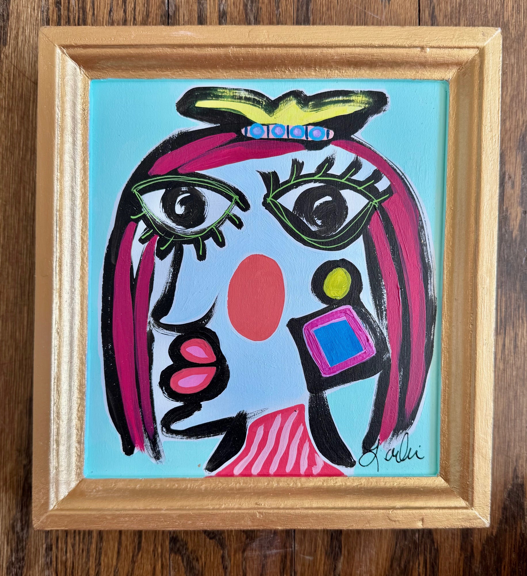 Original Funky Face painting on board. Painting and frame measure approximately 8" x 8". The piece and custom frame are hand cut and handmade so measurements do vary slightly. Perfect for wall hanging or display on a shelf/tabletop. Hanging hardware included.